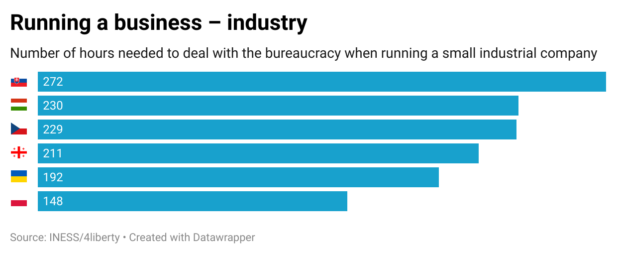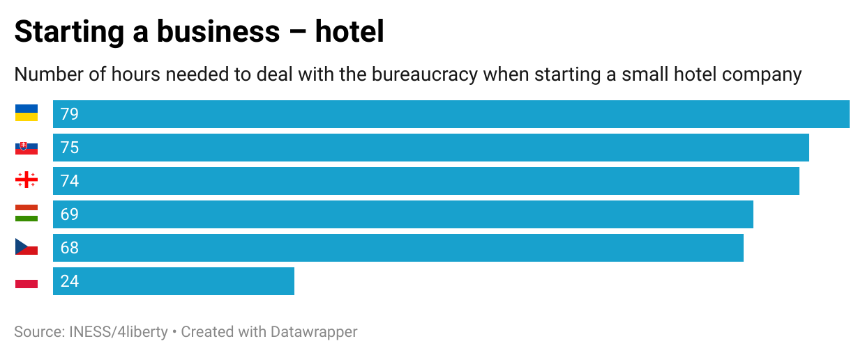 The overall results were calculated by averaging the time required for starting and running a small hotel and an industrial SME. Slovakia had the highest bureaucracy score (328 hours), followed by Hungary and Georgia. Poland emerged as the most business-friendly country with the lowest overall bureaucracy score of 173 hours. Despite the ongoing war, Ukraine has demonstrated the second-best result among all participating countries – 267 hours.